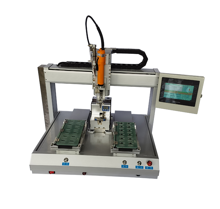 该机器由螺丝排列供料器将螺丝排列到指定的位置,通过机械手抓住螺丝起子到螺丝指定位置进行螺丝的吸取来自动完成锁付产品之功能。